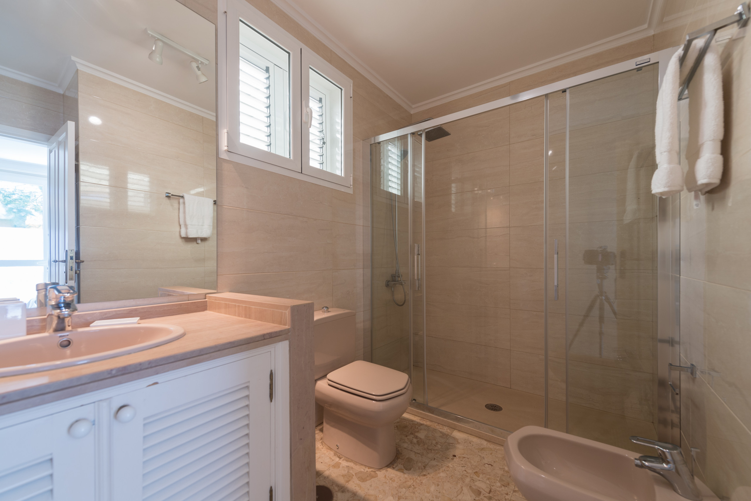 Alberga tres dormitorios dobles, con capacidad para hasta seis personas. El dormitorio principal incluye cama de matrimonio, vestidor y baño en suite, mientras que los otros dos dormitorios cuentan con dos camas individuales cada uno y acceso directo al jardín y piscina a través de amplios ventanales. Un segundo baño completo con ducha está disponible para compartir. Si viajas con bebés, podemos proporcionarte cuna y trona sin coste adicional bajo petición.