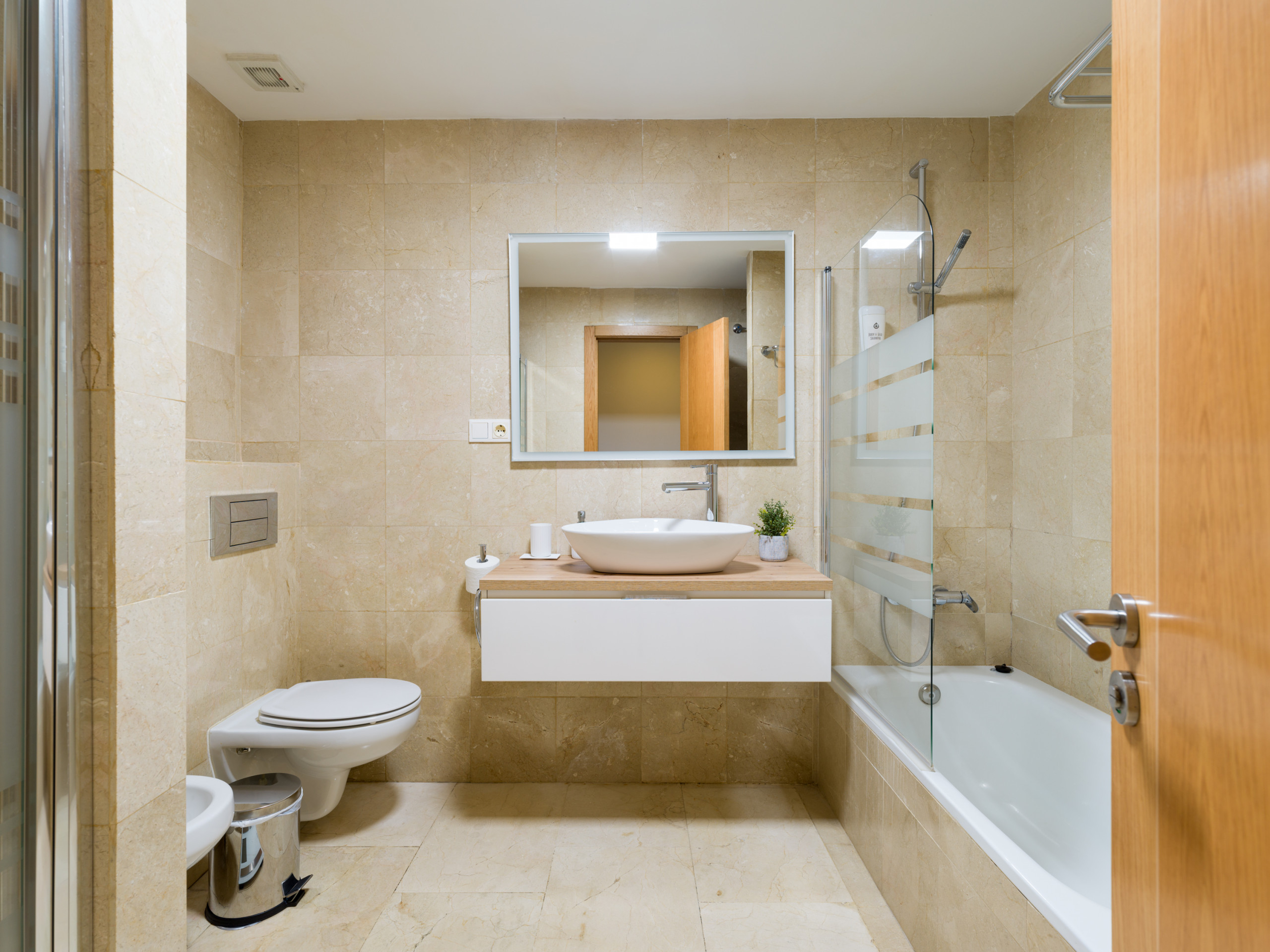 The marble bathroom is very complete, with bidet, WC with dual flush cistern, separate shower and bathtub, both with screens, mirror with integrated light, hairdryer, 30 litre water heater and washing machine.