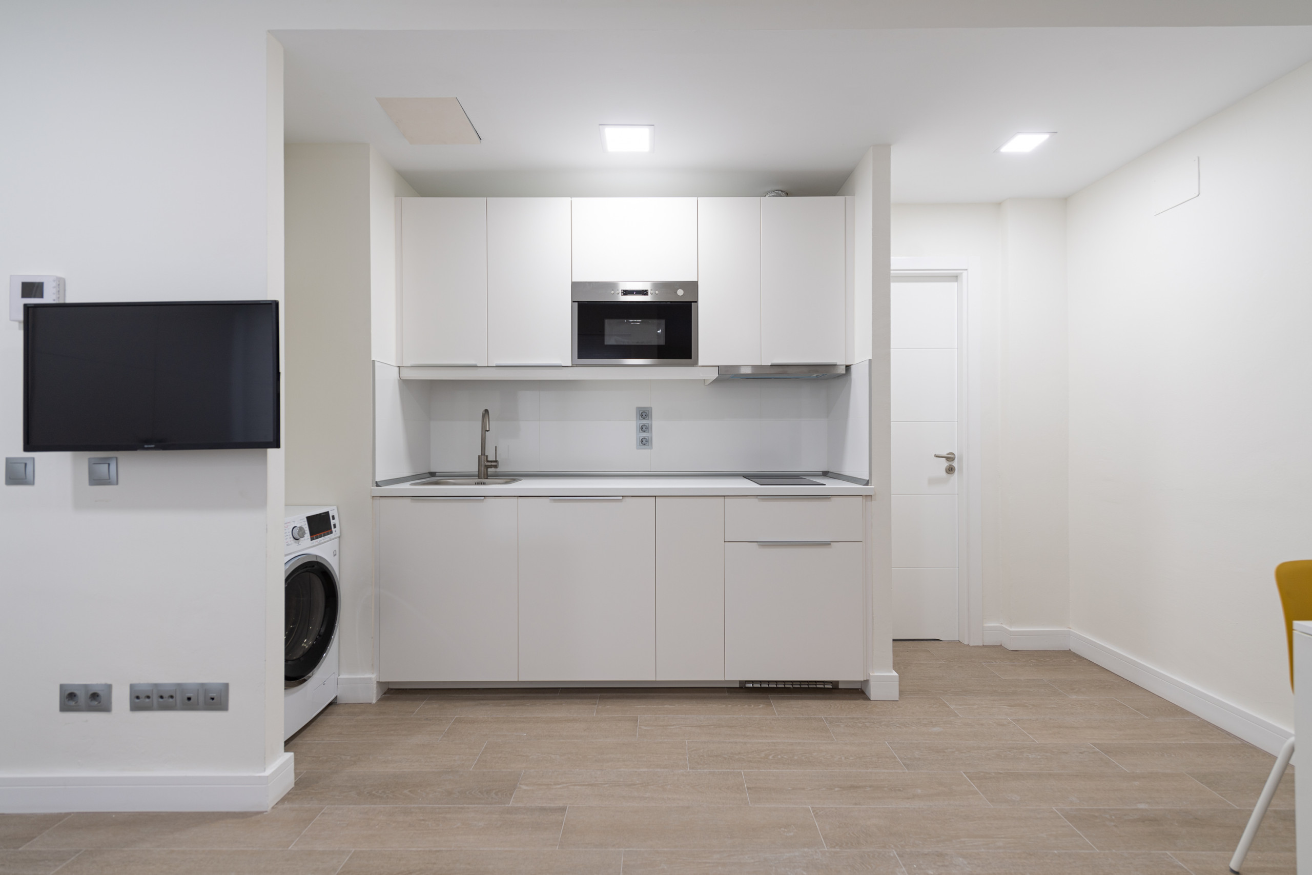 In the vitroceramic independent kitchen, refrigerator, microwave, oven, freezer, dryer, dishwasher, dishes/cutlery, kitchen utensils, coffee machine, toaster and kettle are provided.