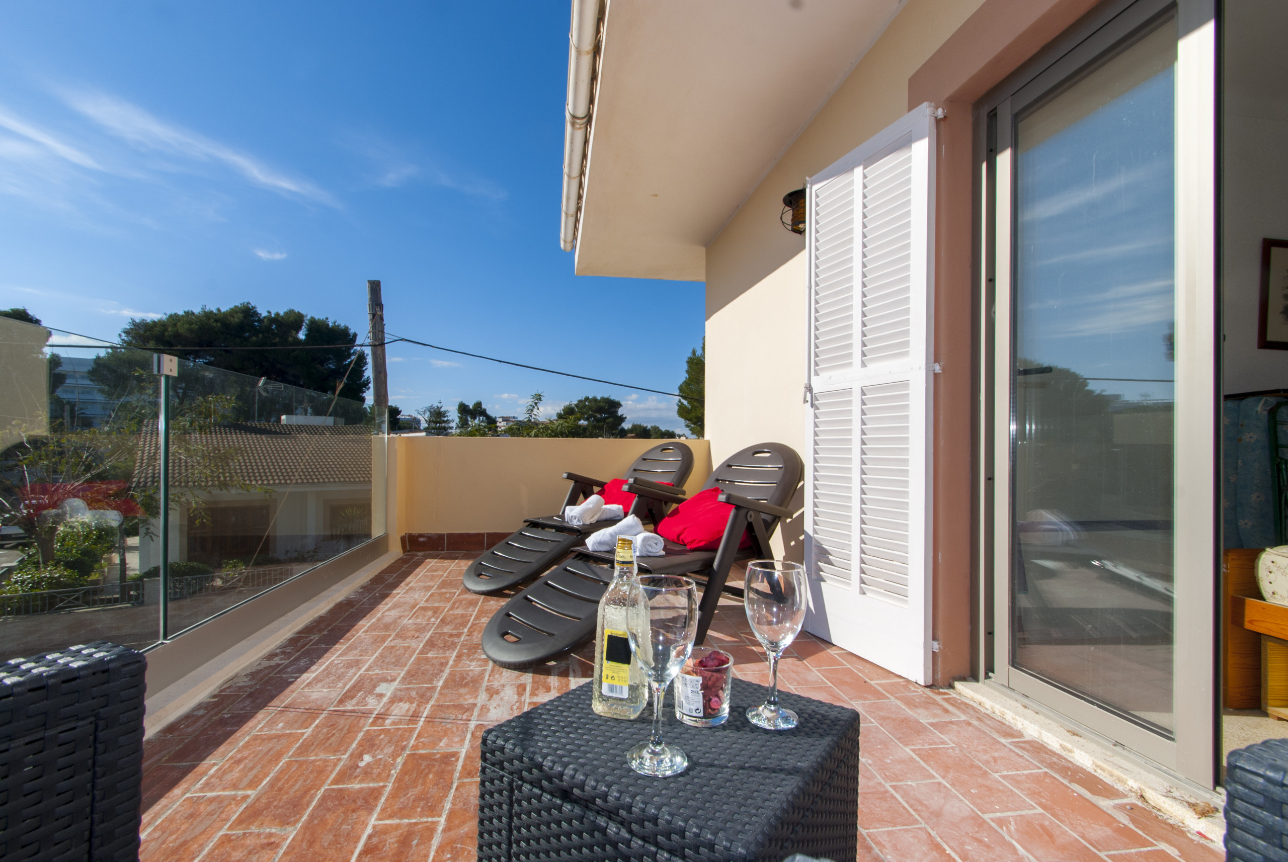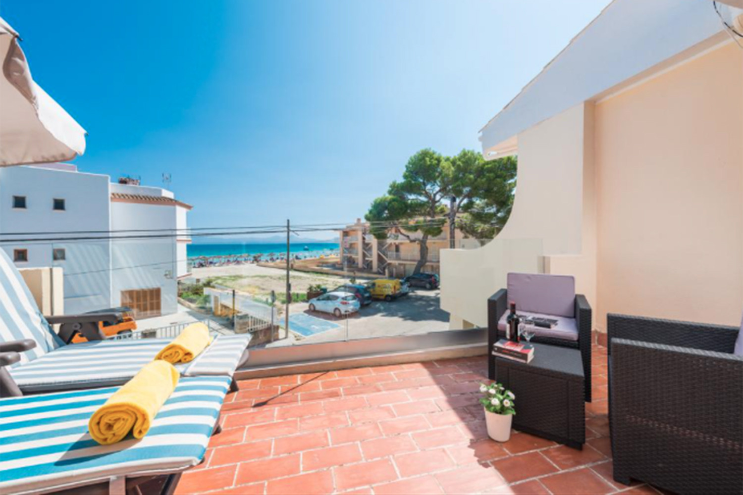 El apartamento cuenta también con dos baños completos, un luminoso salón con un sofá, aire acondicionado en la zona de comedor para seis personas, una cocina totalmente equipada y una espectacular terraza mirando directamente a la playa y el camino de pinos más hermosa de Puerto de Alcudia. El apartamento también dispone de caja fuerte.