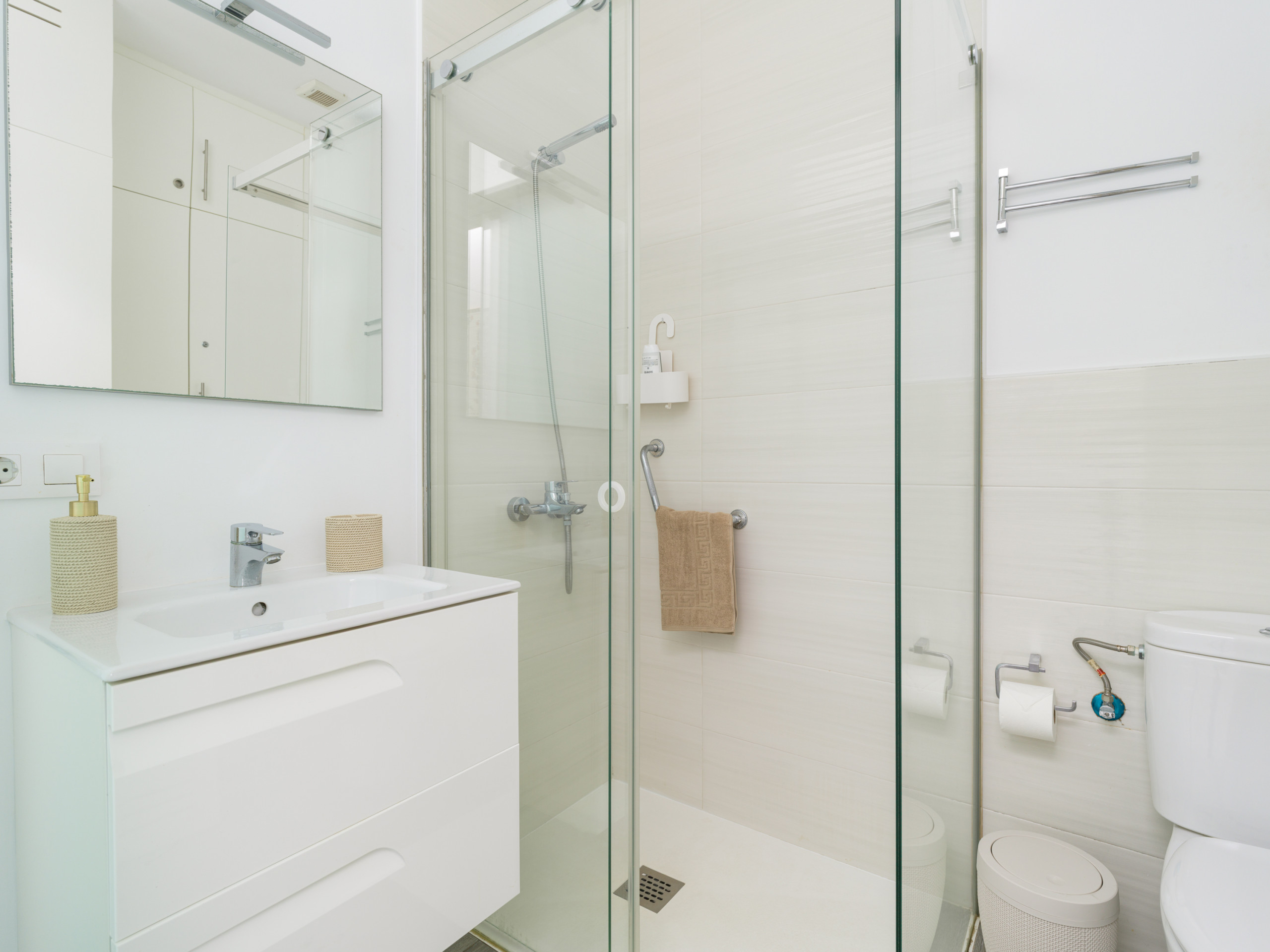 El baño privado con ducha ofrece comodidades esenciales y cuenta con características eco-friendly como inodoro de eficiencia hídrica. El apartamento incluye detalles como TV inteligente, conexión WiFi, plancha, radio y una zona de estar con sofá para máximo confort.