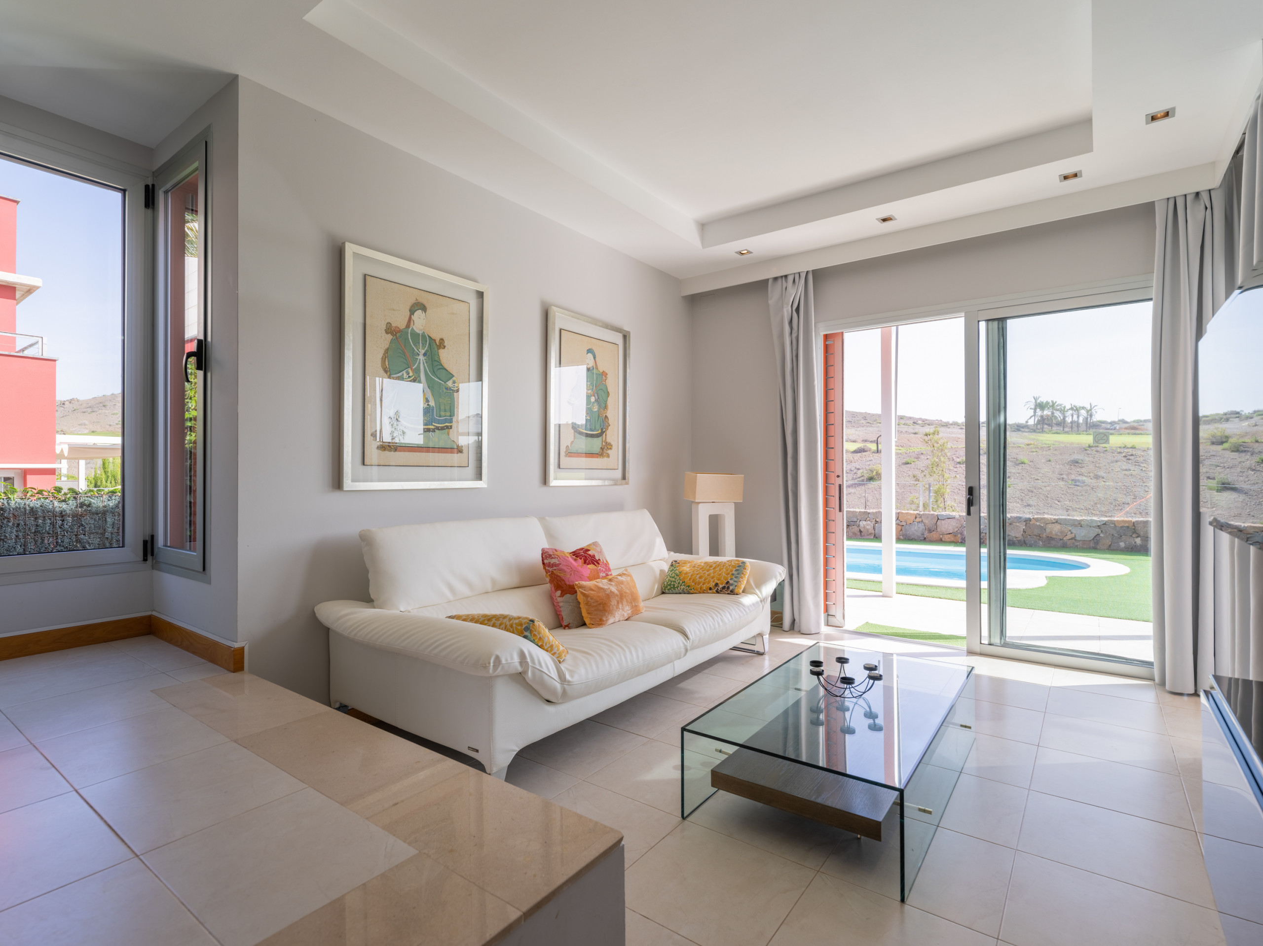 El interior de esta premium villa en Salobre golf se completa con una sala de estar moderna y luminosa y un comedor adjunto a la cocina, que está totalmente equipada.