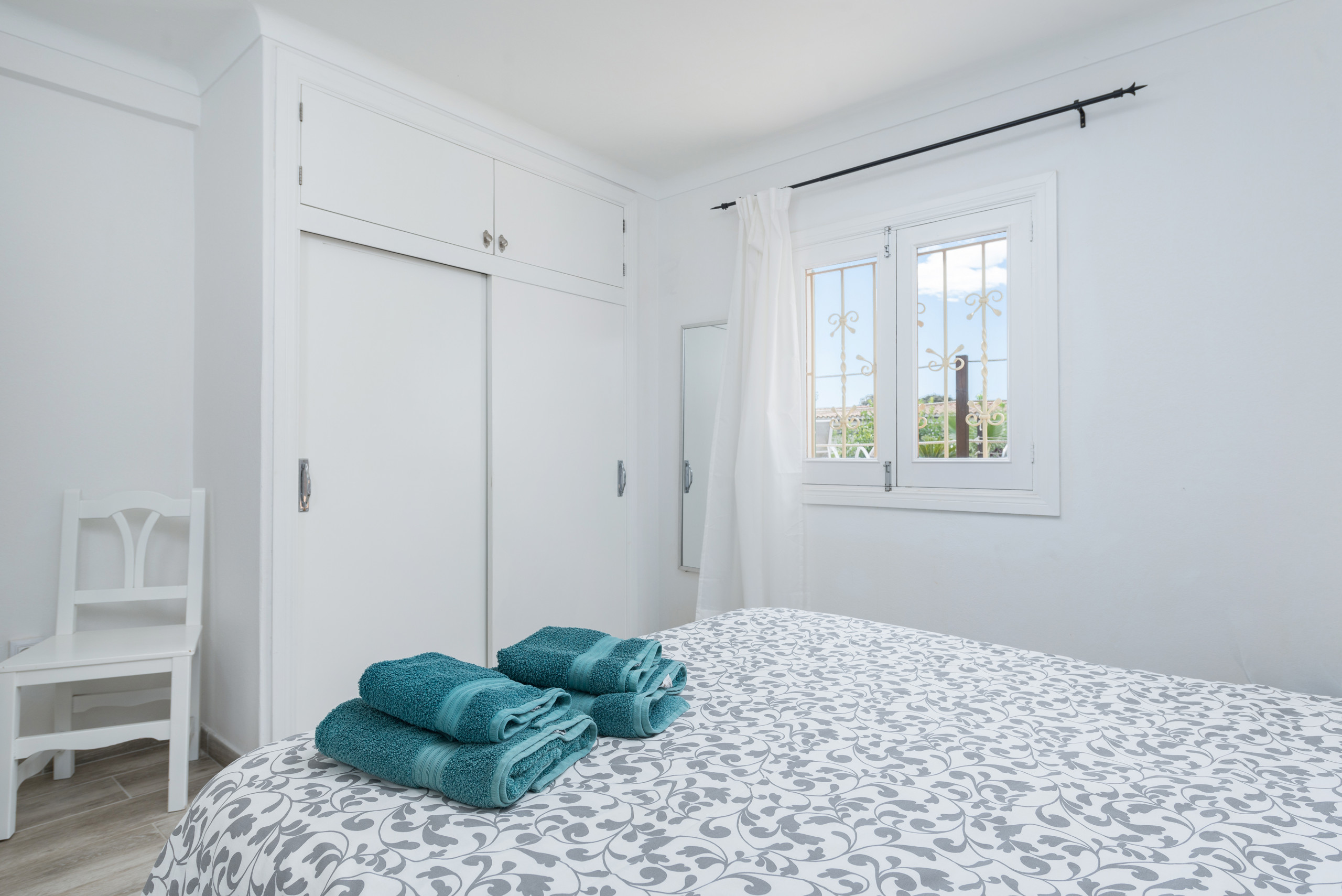 Un pasillo conduce desde la sala de estar a los tres dormitorios. Hay un dormitorio con cama doble y un baño en suite con ducha y dos dormitorios con camas individuales que comparten un baño con ducha a ras de suelo. Todos los dormitorios tienen aire acondicionado y dan al jardín y la piscina.