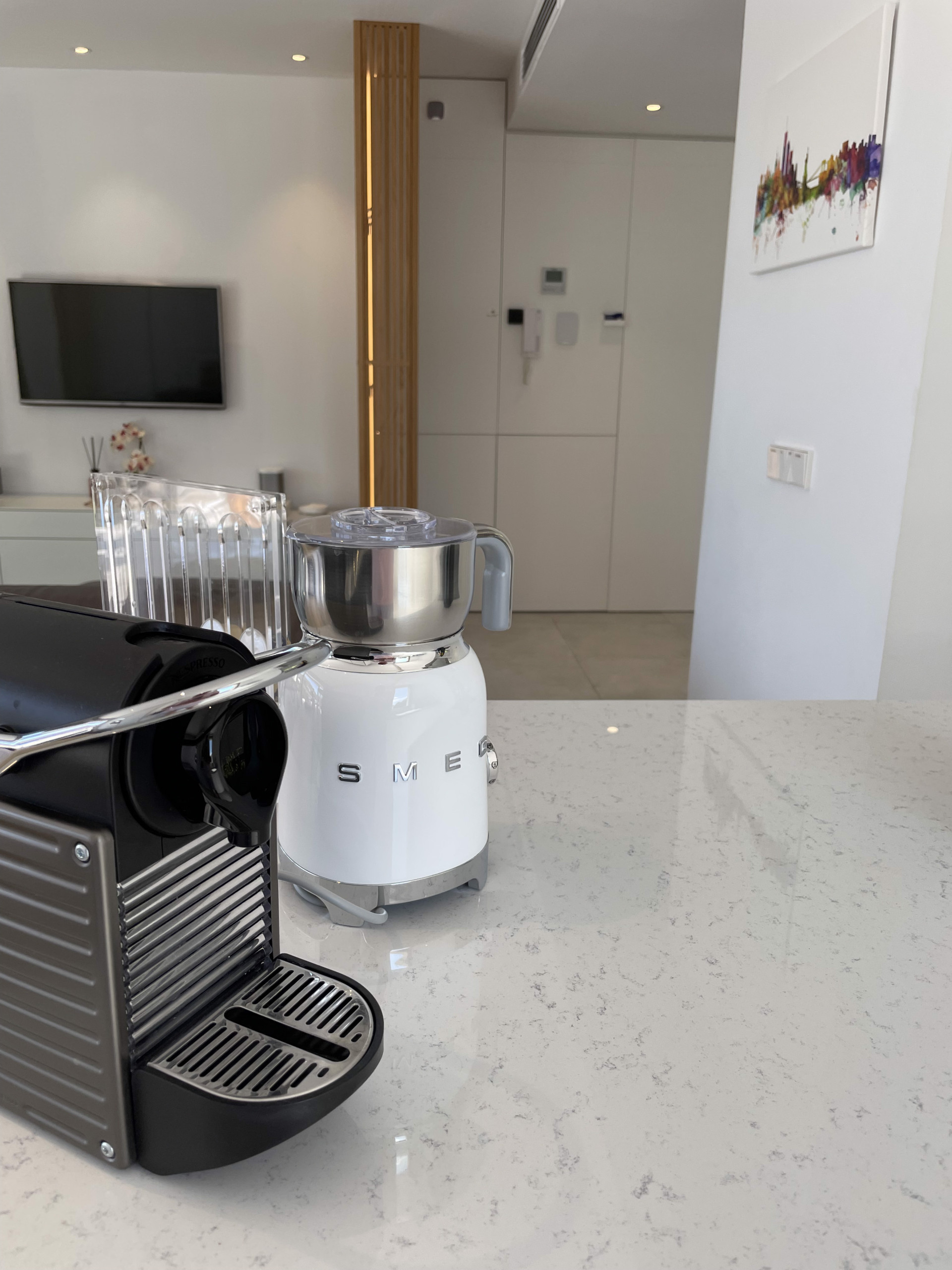 Para preparar las comidas tiene una cafetera Nescafé, una tostadora, una batidora, una prensa de naranjas, un hervidor de agua, un hervidor de huevos, etc.
