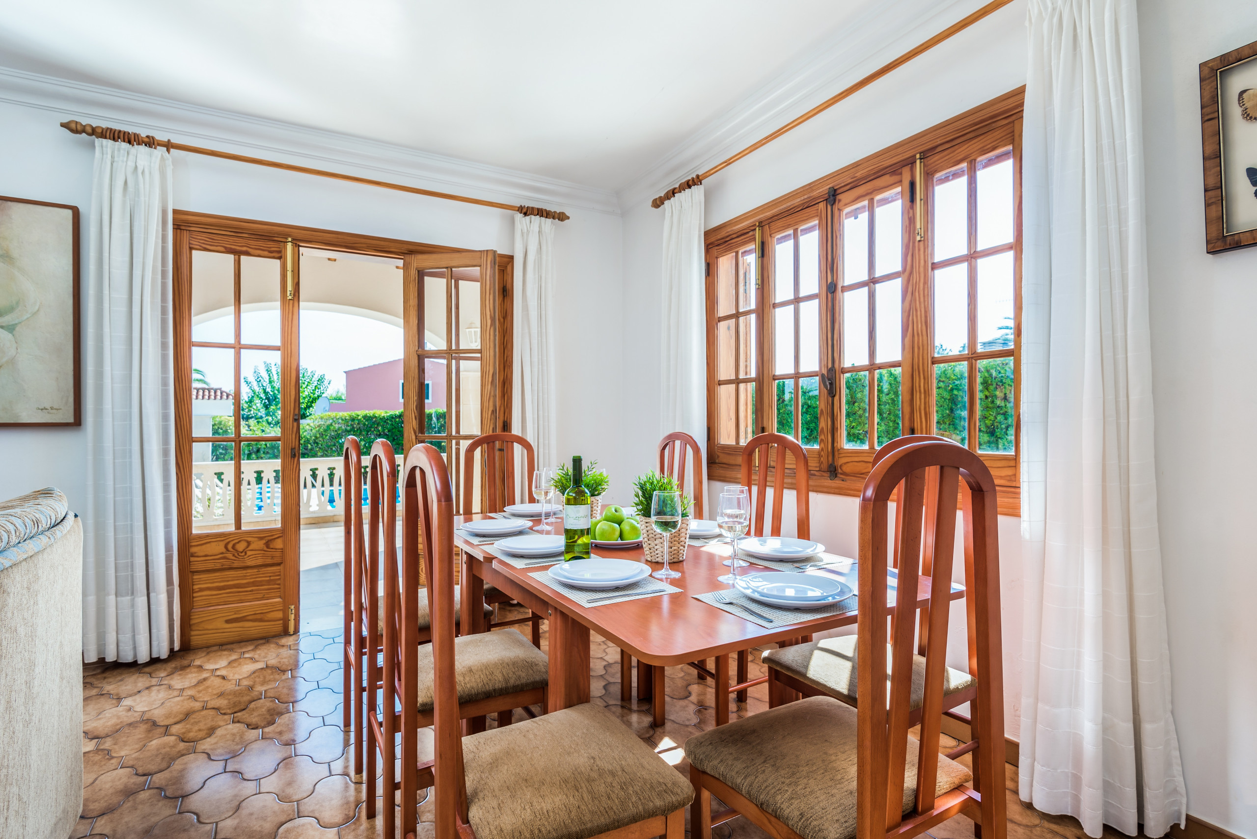 Binisaret... Perfecta para unas vacaciones en familia, ubicada en un gran solar de muchos metros, rodeada de jardín y naturaleza autóctona, para sentirse como en el campo, pero a solo 100 metros de la playa de Arena de Cala Blanca. Tiene una gran piscina de agua salada, y zona exterior muy amplia. La terraza, dispone de mobiliario , para estar cómodamente allí, y en la zona trasera, una preciosa barbacoa de obra, dónde disfrutar de comidas y cenas. Gran salón comedor con Aire Acondicionado, que da acceso a sus 4 dormitorios Capacidad para 7 ocupantes, distribuidos en: Habitación matrimonio, Habitación 2 camas, otra Habitación 2 camas y 1 Hab individual. Una de las habitaciones de 2 camas, se accede a través de la habitación de matrimonio.