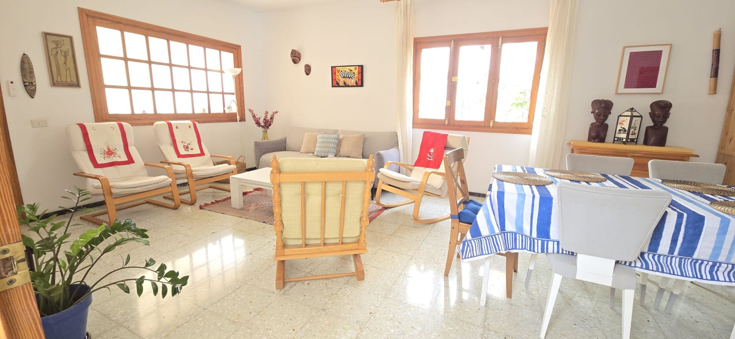 As already remarked by others, this is a roomy house with a lot of character. The bedrooms and kithcen are build around a central living room, which is like a covered courtyard. It is also nice there are many plants. The garden with mangos and papayas is not too big, but there are spots to sit in sunshade on all sides of the house. There were yellow signs with recommendations on the walls, which were often useful. The house is in the village, and the beach is in walking distance. The village of Agaete is very pleasant.