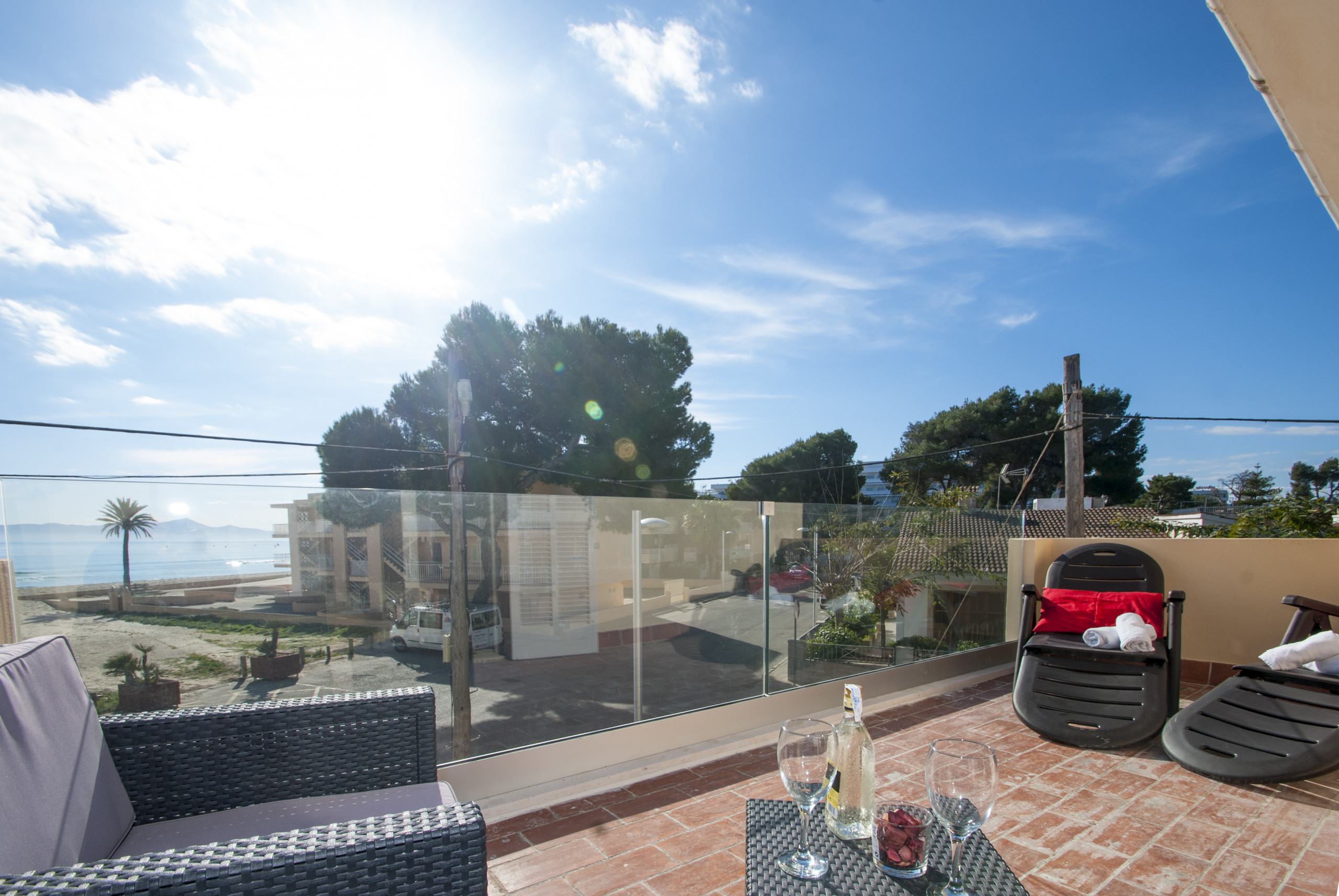 Die Wohnung verfügt über zwei Badezimmer, ein helles Wohnzimmer mit einem Sofa, Klimaanlage im Essbereich für sechs Personen, eine voll ausgestattete Küche und eine spektakuläre Terrasse mit Blick direkt auf den Strand und die schönen Kiefernpfad von Puerto de Alcudia. Die Wohnung hat auch einen Safe.