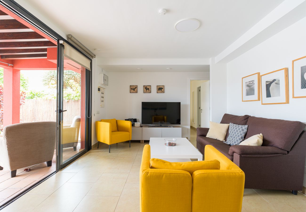 Unterkunft von 80 m², mit schönem Wohnzimmer mit Terrasse mit Blick auf einen ruhigen Gemeinschaftspool und den Strand im Hintergrund.