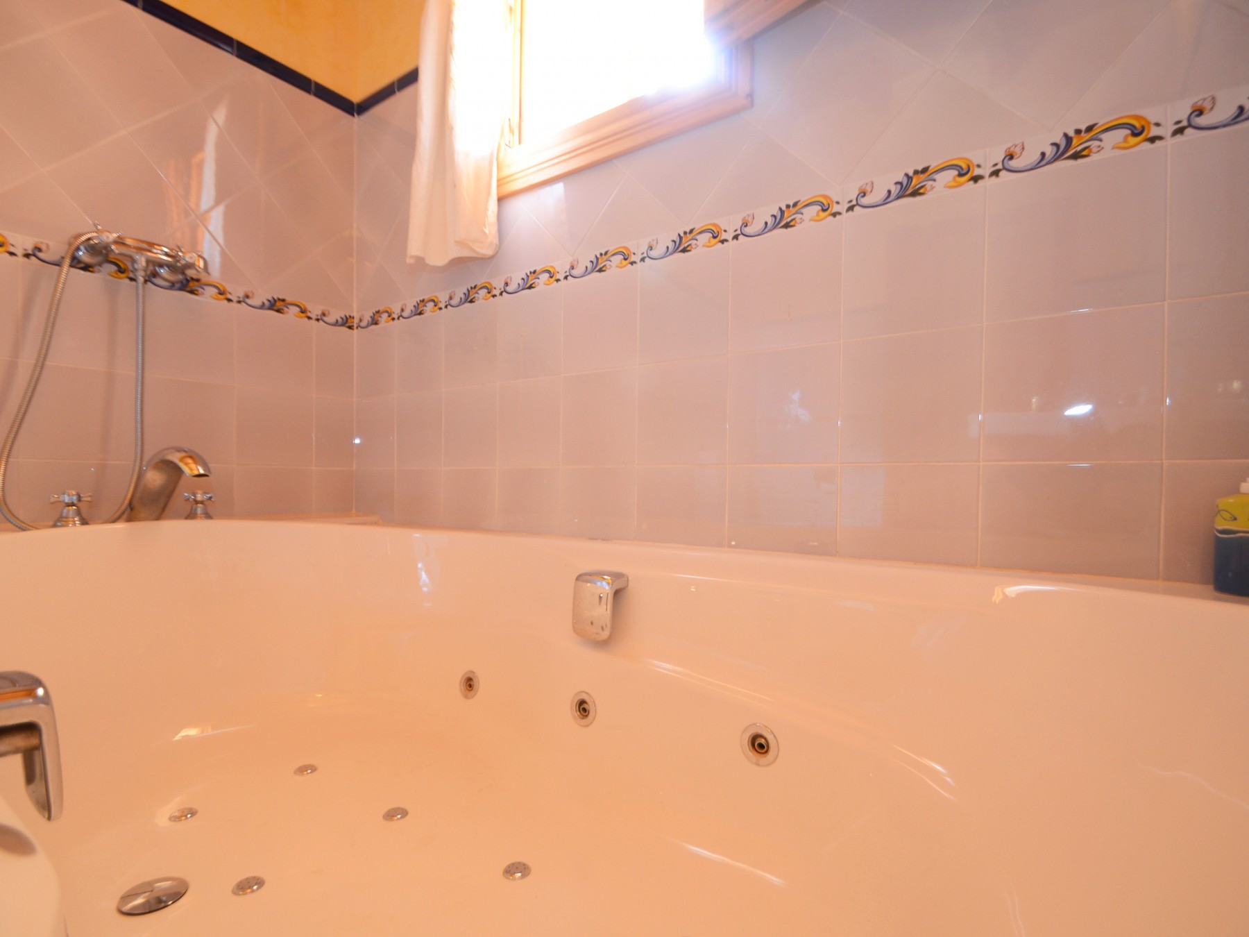 An stairs will take us to the first floor where there are three other rooms. On the right, the main double bedroom, which is a huge room with a double bed, air conditioning, overlooking the gardens and an exquisite bathroom with hidro massage shower.